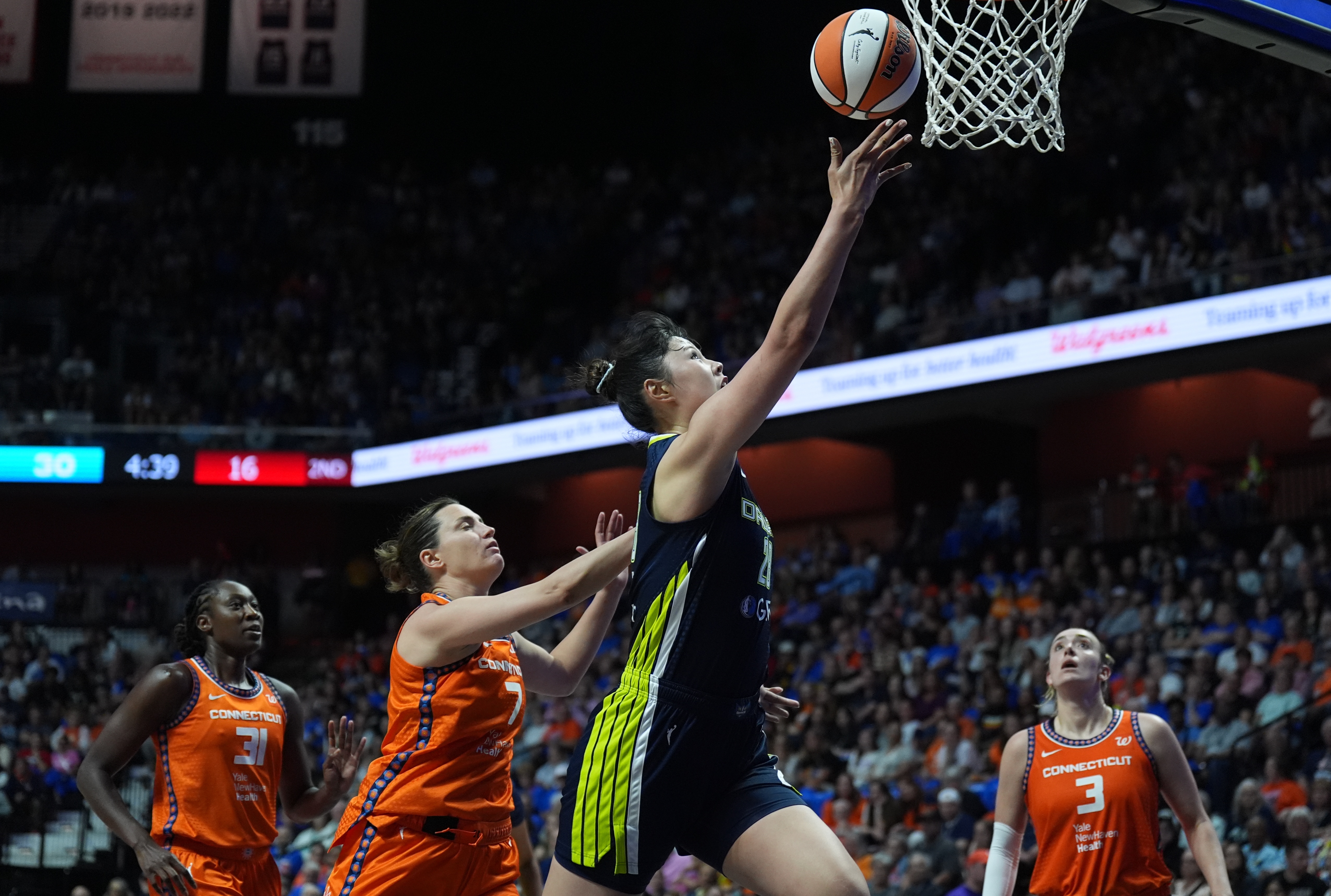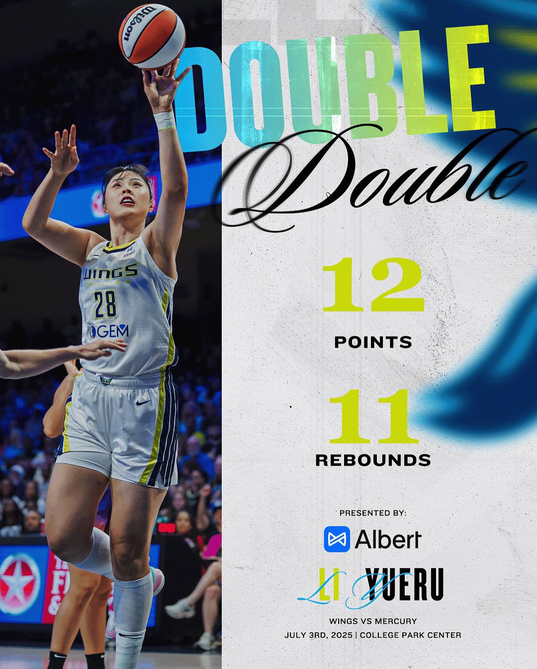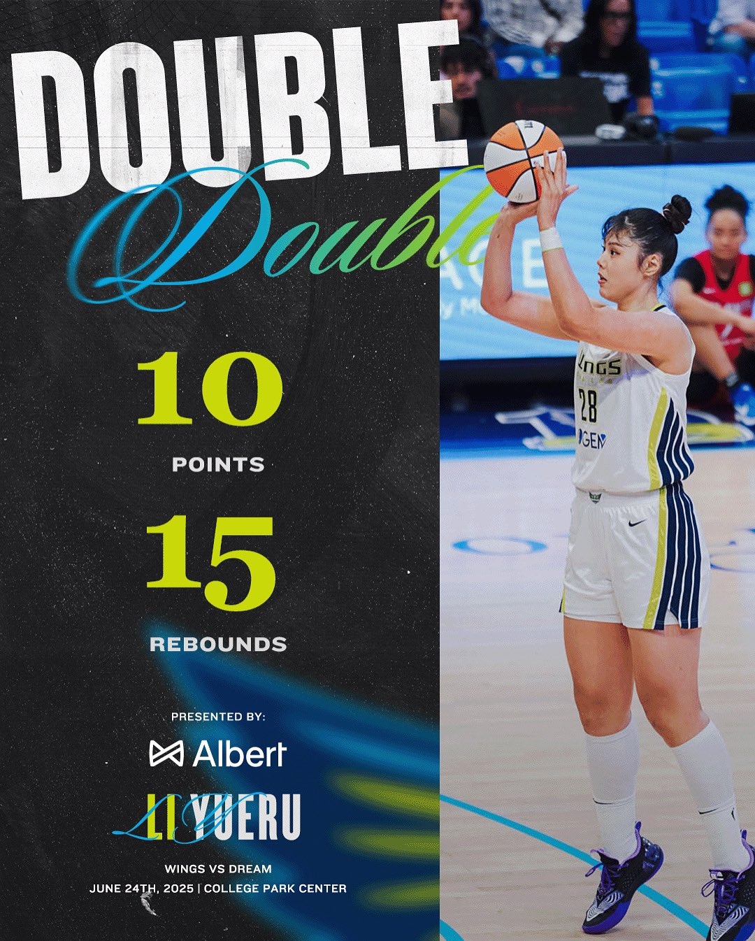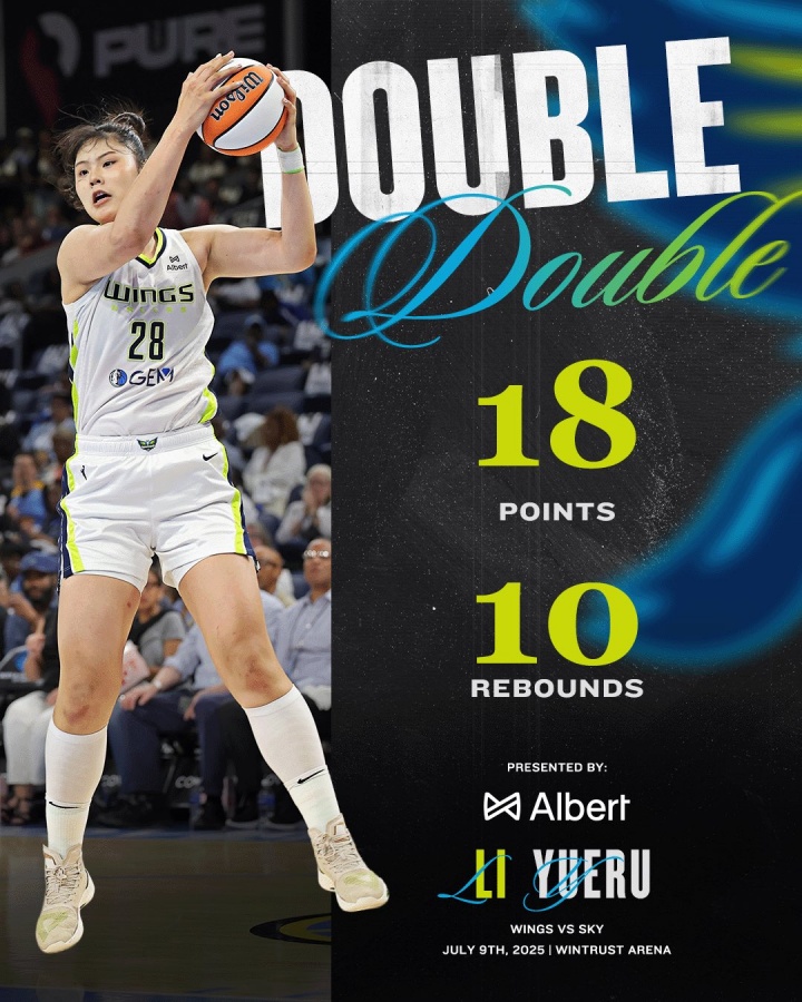 今年6月25日,李月汝迎来了在飞翼的首次首发,而且打出高光表现,登场34分04秒(创个人WNBA生涯纪录,此前是30分50秒),9投4中,三分1中0,罚球2中2,砍下10分15篮板(6个前场板)1助攻1抢断,正负值+18全场最高。